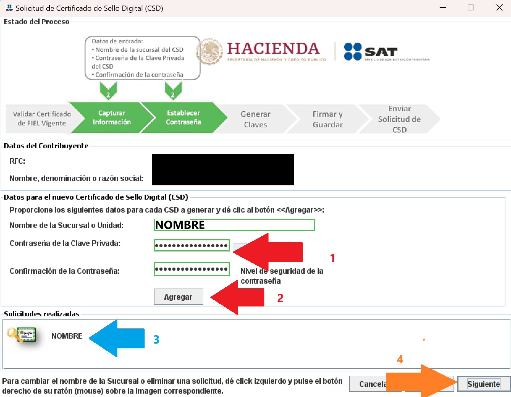 6.1 Luego, una contraseña de tu agrado en “Contraseña de la Clave Privada”. Repitela en “Confirmación de la Contraseña”